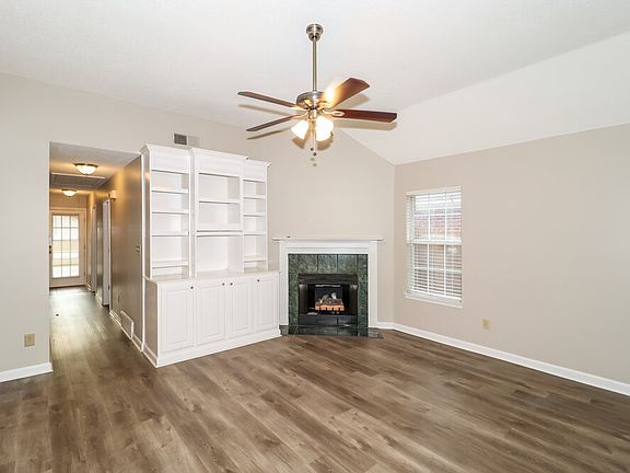 There are numerous attractive details throughout this three-bedroom, two-bathroom rental home in Southaven, Mississippi. The living room features a gorgeous fireplace, laminate flooring, and a built-in bookcase for all your reading material and family photos. A pass-through window opens to the kitchen, where you'll find granite countertops, a breakfast bar for quick snacks, attractive cabinetry, and stainless steel appliances. The adjacent dining room with a chandelier provides the perfect space for indoor meals, or you can eat outside on the backyard patio. Down the hall is the carpeted main bedroom with two backyard-facing windows for a wonderful amount of sunshine. Its en suite bathroom has a one-sink vanity and a walk-in closet for convenient clothing storage. Register today for a tour.