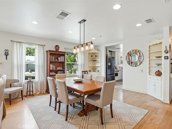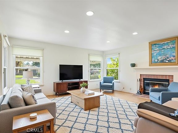 Situated on a sunlit corner lot with mature landscaping and exceptional privacy, this beautifully maintained single-story residence offers space, character, and comfort in equal measure. The home opens to an impressive living room featuring a classic brick fireplace with gas starter, and expansive windows that frame the garden and fill the interior with natural light. The adjacent dining area flows effortlessly into a bright, well-appointed kitchen that combines charm with modern convenience, including dual stoves and updated appliances.