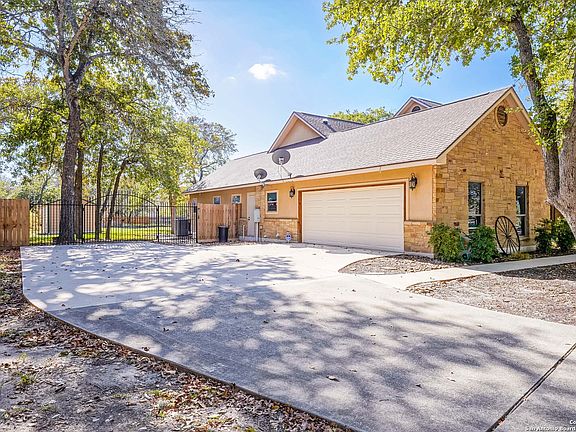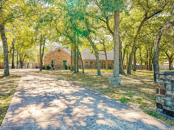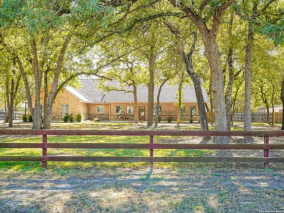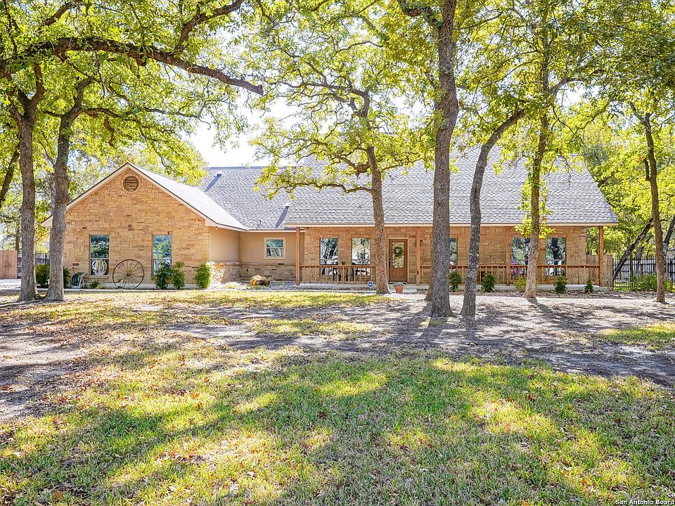 Country living at its finest! Discover serenity where Country charm meets modern comfort in this beautiful, meticulously maintained single-story rock and stucco home, nestled on a heavily treed 1.2-acre lot in peaceful La Vernia. The fully fenced, private backyard is an oasis, featuring a refreshing in-ground pool (new pump 2023) and ample patio space for outdoor enjoyment. Key updates ensure peace of mind: an upgraded roof (2021) with three solar tubes, a two-year-young HVAC system, and two newer water heaters. A sprinkler system and charming wrought-iron gates add to the impressive curb appeal. Inside, an open floor plan awaits with high ceilings, elegant ceramic tile floors, granite countertops, custom cabinetry, and a gorgeous stone fireplace. The primary suite is a true retreat, boasting two closets, private outdoor access, a spacious walk-in shower with double heads, and a jetted tub. The 4th bedroom is being used as a study (home does not have both) with glass french doors open to entry. Practical features include an oversized two-car garage for storage and full-size vehicles, a large covered front porch perfect for relaxing, and a substantial 16x12 outbuilding with electricity and a solid slab foundation for all your storage needs. This exceptional property, lovingly cared for by its original owner, is competitively priced for a quick sale and offers outstanding value."