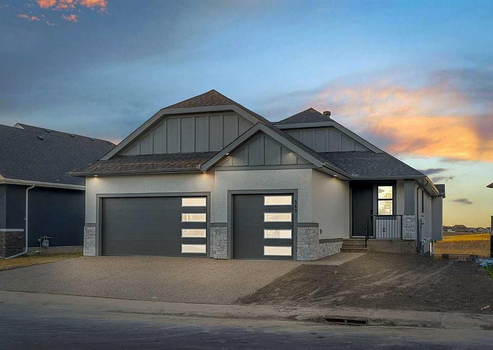 OPEN HOUSE SUNDAY 1 PM - 3 PM *** LARGE TRIPLE CAR GARAGE – GOLF COURSE VIEWS – MASSIVE LOT *** Welcome to 569 Muirfield Crescent in the friendly community of the Lakes of Muirfield. This fully finished bungalow offers high end finishes with over 3,200 sq. ft. of living space on a large 61.5 x 131 lot, backing directly onto the golf course with no rear neighbors. This same house in other areas can cost upwards of $200,000 to $400,000 more so the value is hard to ignore here. There is 1 other bungalow available with a walk-out getting ready, ask to view that. For this bungalow, the mainfloor and basement both offer 9 feet ceilings, knockdown ceilings and 8 foot doors on the Mainfloor. The kitchen offers quartz countertops, a corner pantry, large island, and comes with an appliance allowance to choose your own appliances. Adjacent to the kitchen is a bright dining area and a living room with an electric fireplace, all opening onto an extra-wide (FULL HOME WIDTH) private balcony with beautiful fairway views, perfect for relaxing or entertaining. The primary bedroom features a 5-piece ensuite with double sinks, soaker tub, separate glass upgraded shower (10 mm glass, seating area + massive tiles to the ceiling), and a walk-in closet. There is another second bedroom and another full bathroom complete the main level. The finished basement includes 2 large bedrooms, a 5-piece bathroom, a huge rec room, a wet bar, and lots of storage/utility space—perfect for entertaining or extended family. The triple front-attached garage (nearly 31' x 26') is drywalled and insulated, with lots of room for vehicles, even your large trucks and tools. The wide driveway provides even more parking. The exterior is high quality stucco, exposed aggregate concrete driveway and steps. All premium features that are usually big upgrades in other communities. The other nice thing about this location is that you’re not going to be surrounded by more construction and can enjoy your home more peacefully. A rare chance to own a new, move-in-ready bungalow backing onto the golf course in a quiet, secure community. Book your showing today!