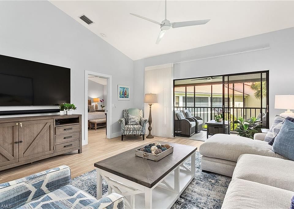 Nestled in the private oasis of Serendipity this beautifully renovated, turnkey, two bedrooms, two baths, furnished, coastal contemporary condo in Pelican Bay is move in ready. Within this spacious open-concept home is wide plank porcelain tile flooring with soaring vaulted ceilings. The kitchen has been totally remodeled including Adomus ¾" custom cabinetry, Pompeii quartz countertops, pantry, magnificent center island with counter seating and stainless-steel appliances. Each bathroom has been updated with high end finishes which include high gloss ceramic backsplash, frameless ultra clear glass shower, fogless mirrors and walk-in closets. This gorgeous second floor unit also offers plantation shutters throughout, LED lighting, remote controlled window treatments and a large screened, glassed in lanai and access to two pools, spas, and club house all surrounded by lush, beautifully landscaped grounds. This conveniently located condo offers proximity to Artis Naples/Baker Museum, Waterside Shops, two private beach-club restaurants with beachside dining, chair and umbrella services, kayaks, sail boats, paddle boards, convenient tram service for easy access, and miles of nature trails great for biking, walking and jogging. As a Pelican Bay resident, enjoy world class amenities which feature three miles of private beach front, a vibrant Community Center, art studio, card rooms, state-of-the-art fitness center, full-service fitness classes, wellness spa, world-class tennis with 18 Har-Tru courts and a new Racquet Center that will include 8 additional Har-Tru courts and 20 pickleball courts. Pelican Bay offers the ultimate Naples lifestyle. Don't miss this rare opportunity!