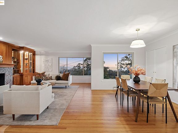 Montclair Hills Living at its Best! This charming 1950s ranch-style home, nestled on a quiet cul-de-sac, offers a peaceful retreat with stunning views of San Francisco and the Bay. Its spacious, well-designed layout includes 3+ bedrooms, 3 baths and 2,179 SF. Inside, the expansive living and dining room features custom built-ins and a striking wood-burning fireplace, with large windows framing picturesque Bay views. The updated eat-in kitchen provides a delightful space for culinary endeavors and seamlessly flows onto the level patio - ideal for outdoor dining and entertaining amid mature gardens. The main level hosts a primary suite, spacious second bedroom, a full hall bath, and an office that doubles as a bedroom. The versatile lower level serves as a family room, extra bedroom, or home office, complete with a full bath and both interior and exterior access, perfect for guests or a media room. Set on a 5,949 SF lot, the beautifully landscaped gardens with redwoods and fruit trees create a lush outdoor oasis. This home also includes interior access to a two-car garage, a dedicated laundry room, and a newer roof. Enjoy proximity to Montclair Village, transit, and freeways, all while basking in the serene hills location. Don't miss this opportunity for tranquil, modern living!