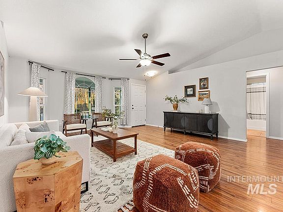 A charming single-level home set on a sprawling corner lot in Columbia Village! Inside, recent upgrades blend seamlessly with the home’s vaulted ceilings and luxury vinyl plank flooring. The kitchen features newly installed quartz-marble countertops, a breakfast bar, and a generous pantry, while the dining area opens directly to the covered patio with a privacy screen for effortless indoor–outdoor living. The primary suite includes a custom shiplap accent wall and an en-suite bath showcasing a newly updated glass walk-in shower. The backyard continues to impress with custom garden beds and a spacious lawn, complemented by the added privacy of being on a corner lot. Enjoy the Columbia Village amenities, with a community pool, recreation center, parks, and more. Ideally across the street from Trail Wind Elementary, blocks from Le Bois Jr. High and the Simplot Sports Complex, and just minutes from Bown Crossing, the Boise River Greenbelt and Downtown Boise. This home combines comfort, convenience, and exceptional Southeast Boise living.