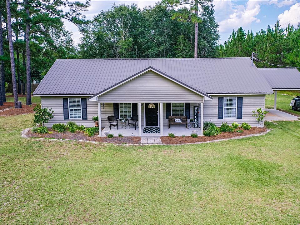 Here's a charming and updated home in the country. This tastefully updated home offers 3 bedrooms and 2 full baths, and over 1500 sq ft of living space, all situated on a spacious 1-acre lot. An inviting front porch welcomes you into the large living room with carpeting. The updated kitchen features newer appliances, stylish countertops, and a tiled backsplash, opening to a dedicated dining area. The primary suite includes a walk-in closet and a fully renovated bath with modern tiled shower. Two additional bedrooms are generously sized with carpet, while the second full bath has also been completely remodeled to include a tub/shower combo. Step outside to the covered back deck, perfect for relaxing or entertaining, and enjoy the expansive backyard with partial privacy wood fencing. A 12x20 metal building provides extra storage or a great workspace. Additional highlights include a covered single car attached carport, metal roof, new HVAC system (March 2023), updated electrical (by Mill Creek Electric)...This move-in ready home has been updated and ready for its next homeowner. Come take a look as you will be impressed!!!