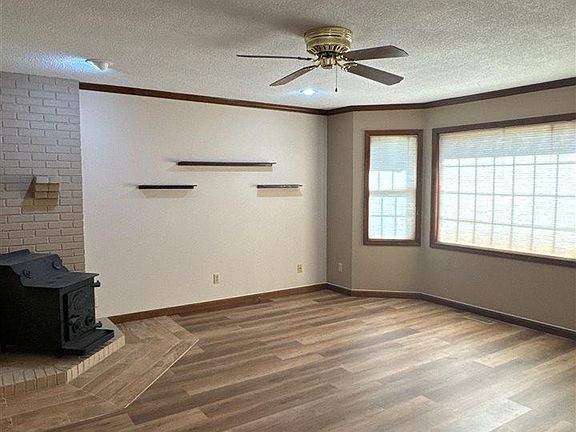 Lakefront retreatBrick gas log fireplaceOpen deckCurved wood staircaseCovered front porchDouble sinksSmall fenced area