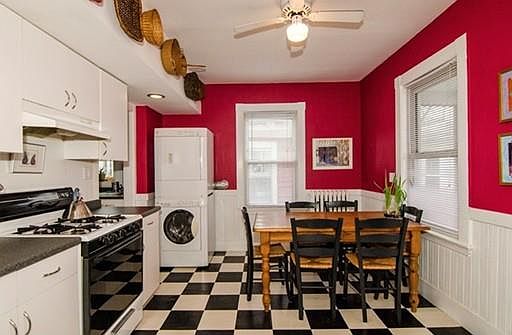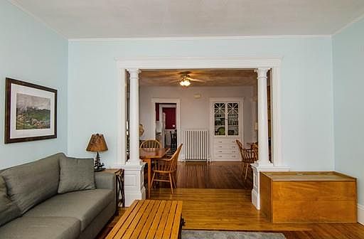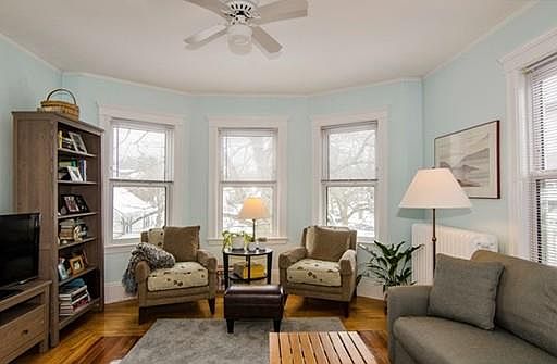 Sunny and spacious! Bright and roomy! Wonderful penthouse condominium. Huge living/dining room with beautiful wood floors, bow windows, and built-in china cabinet. 2 bedrooms, one bath, and a home office. Private screened porch, in-unit laundry. Potential expansion in deeded attic. All this and close to parks, schools and public transportation.