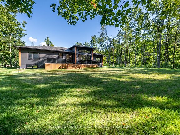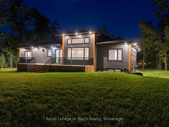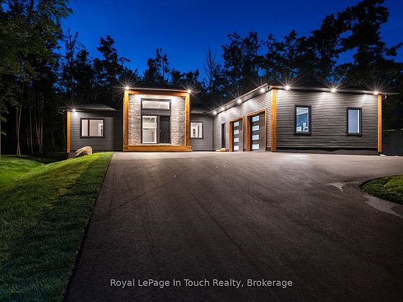 Welcome to this stunning, brand new estate bungalow located in a quiet community just 5 minutes from a 36 slope ski resort and snowmobile trails. With quick highway access, you are only 25 minutes from Barrie, Midland, and Orillia and just 1.5 hours from Toronto. Designed with comfort and entertaining in mind, this new home features a spacious layout with a grand entryway, 14 ft ceilings in the great room, and 9 ft ceilings throughout the main floor. The large great room offers a cozy gas fireplace and flows into a beautifully appointed kitchen with quartz countertops, a large island, and sliding glass doors that open to a deck overlooking your private yard. The main floor also includes a luxurious primary suite with a stunning 5-piece bath featuring a soaker tub and dual-head shower, two additional bedrooms, a home office, and convenient main floor laundry. Downstairs, the finished lower level boasts 8 ft ceilings, a large rec room with a gas fireplace, a wet bar with wine fridge perfect for entertaining and an additional bedroom and second office. A separate entrance through the oversized garage adds convenience and flexibility, with plenty of space for all your toys and gear. This exceptional home offers the perfect blend of luxury, functionality, and location ideal for enjoying four-season living close to nature and city amenities.