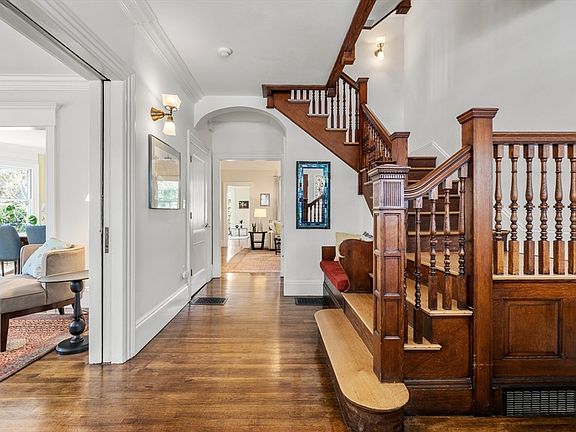Coined by Robert Frost as "Brewster Village," this expansive home is sited on one of the most desirable streets in the city. Through the grand foyer, the gracious living room sits behind pocket doors, and seamlessly flows into the family room adorned with a fireplace, and a door to the dining room. The massive eat-in kitchen is accessed through pocket doors, and showcases stone countertops, high-end stainless steel appliances, a gas stove, island, and eating area with French doors to the patio & fenced-in yard. The 2nd floor houses the gracious primary suite with 2 walk-in closets, a gas fireplace, en-suite 4-piece bath with a soaking tub, and French doors to a 15' porch. There are 2 additional bedrooms and a hall bath on this level. The 3rd floor houses 3 more bedrooms and a hall bath. The top level offers a large creative space with a vaulted ceiling and 3 skylights. On the lower level, there is a 25' playroom, mudroom with walkout exterior access, full bath, laundry & bonus spaces.
