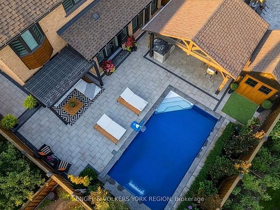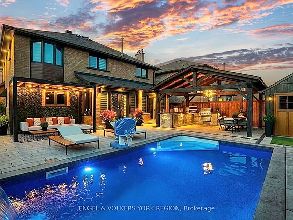 Embrace a truly breathtaking family home, redesigned top to bottom with luxurious high-end finishes. Remodelled in 2023, the custom kitchen stuns with its two-tone black and walnut-style cabinetry, leathered quartzite counters and backsplash, Thermador appliances, an oversized panelled fridge/freezer, panelled dishwasher, beverage fridge and walk-in servery with prep sink and glass wine cellar. The grand island and coffee bar feature accent lighting and overlook the designer backyard, setting the tone for effortless hosting and day-to-day enjoyment. Step outside and feel like you've arrived at a private resort. A 12' x 22' in-ground saltwater pool (2020) with a waterfall feature is surrounded by premium interlock, a pergola, and custom cabana complete with stone outdoor kitchen, built-in BBQ, beverage fridge, leathered quartzite counters, covered dining area and garden irrigation system. Every detail is meticulously crafted. The exterior front has been refaced with modern stone veneer and walnut-style siding, paired with a large interlock driveway with concrete underlay and full landscaping (2023) - creating show-stopping curb appeal. Inside, elegant porcelain tiles and engineered oak hardwood elevate the main level. A main-floor office/den, feature walls with accent lighting, and a grand staircase with wrought iron spindles, custom panelling and waffle ceiling add refined ambiance. Upstairs, four spacious bedrooms await. The luxurious primary suite offers a spa-like ensuite with electric heated floors, double vanity, freestanding tub, large glass shower and built-in storage. The fully finished basement features a modern kitchen with stainless steel appliances, wet bar, gym room, upgraded 3-piece bath, two large cold cellars and a separate walk-up entrance - perfect for in-law suite or rental potential.Located in a fantastic Woodbridge location with south exposure, minutes to Hwy 400/407, great schools, parks and everyday conveniences. Furniture negotiable.