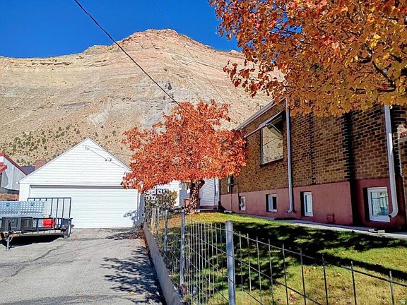 GREAT HOME IN HISTORIC HELPER, UTAH located on a dead-end street. Turn this home into your personal art studio with the beautiful mountains in the background. There are 4-bedrooms, 1.75 bathrooms, 2 car garage with storage on two city lots with alley access. Take a tour of this spacious brick Tudor-style home with over 3,600 square feet. This property offers the perfect blend of privacy and conveniently located a short distance from downtown Helper. The main level of this charming home features two bedrooms and a full bathroom along with built-In storage in the hallway. Additional storage can be found in each bedroom closet, ensuring ample space for all your belongings. Entertain guests in the formal living room, which provides plenty of space for family and friends. Adjacent to this is the formal dining room, perfect for enjoying dinner with loved ones. The eat-in kitchen is a cozy spot for casual meals, equipped with a large walk-in pantry and newer appliances, making it a practical and inviting space for cooking and dining. The expansive family room addition features real hardwood flooring and a stunning rock fireplace with a woodstove insert, ideal for those cooler evenings. With large picture windows in the living and dining rooms, the main level is bathed in natural light, creating a warm and inviting atmosphere. The basement offers 2 additional bedrooms and a 3/4 bathroom with a corner shower with natural light. Relax on the patio and soak in the peaceful surroundings of Helper while appreciating the nearby beautiful rock mountains. Enjoy the view of the famous balanced rock sitting on top of the mountain nearby. The property is home to an apricot tree, apple tree and walnut tree, adding to its charm. A manual sprinkler system helps maintain the lush greenery. The detached two-car garage provides plenty of storage space, ideal for vehicles and outdoor equipment. The home features several updates, including a newer roof and siding on the family room. Tax ID: 1A-1082-0000 is included in the sale. Water shares are included with the sale. Conveniently located near ATV trails, the Helper River walkway and a vibrant arts community. Perfect home for those who love outdoor adventures and cultural experiences. Square footage figures are provided as a courtesy estimate only and were obtained from the Carbon County Tax Records. Buyers are advised to obtain an independent measurement for accuracy.