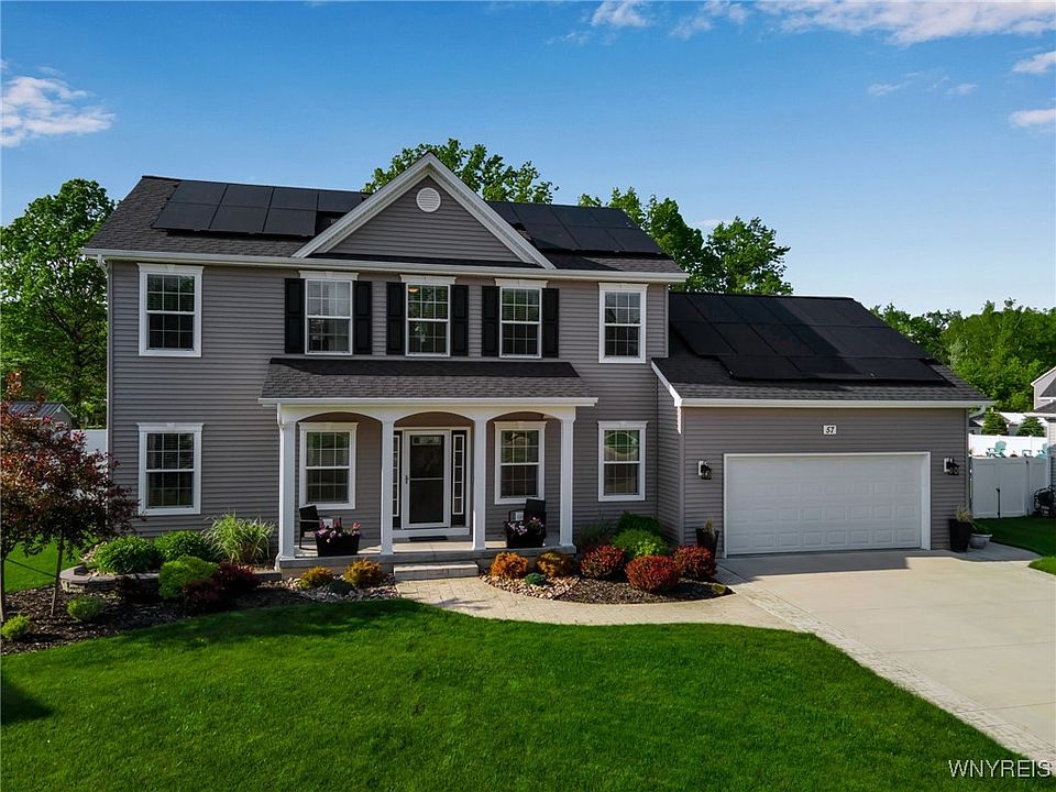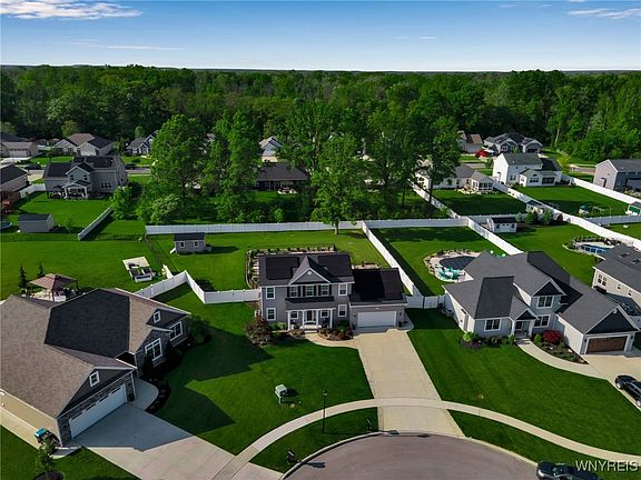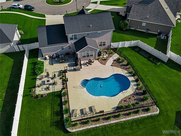 Fantastic opportunity to own a nearly new Stickl built home on cul de sac located in a newer subdivision . This beautiful home is better than new with so many after built amenities added. Reap the benefits for years to come from the solar panels the owner has invested in! Act quickly and you will still have time to enjoy the backyard paradise this summer. Complete with expansive stamped concrete patio, Spectacular in ground pool surrounded by professional landscaping,large shed and lots of grassed area this yard is perfect for entertaining or relaxing with your family. A vinyl privacy fence surrounds the yard (one section black link). Open,bright and spacious best describe the interior with an open kitchen/morning room tastefully done in neutral colors. Granite counters, quality cabinetry and stunning hardwood floors that run throughout the first floor. The study has a sliding door for privacy.Gas fireplace with beautiful tiled surround and classic wood mantle is the focus of the great room.Rear entrance boasts a half bath,built in cubbies and the 1st floor laundry. The second floor features a spacious master bedroom with his/hers walk in closets,tiled shower and granite countertop. The two other bedrooms share a full bath down the hall . The full basement features a full egress window and can serve as future additional living space! Walking distance to state park and extensive walking trails. Less than a mile from thruway entrance and minutes to Niagara Falls and Buffalo! Showings start Sunday 6/1 at the open house from 11-1. OFFERS DUE OM WEDNESDAY 6/4/2025 @ 3:00pm.