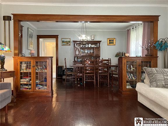 Introducing a charming 3 to 4-bedroom Craftsman-style home with many spacious living options for a family. Original hardwood floors and built-in bookcases between the living and dining room, keeping the character of the craftsman bungalow. This spacious residence offers ample storage and a serene, private fenced backyard, perfect for your family's needs. The exterior has a new metal roof, vinyl siding, vinyl windows, and a lovely front porch for watching sunsets. Huge amounts of storage throughout the home, with many built in storage cabinets upstairs and also in the basement, along with two walk-in storage areas. The detached oversized one car garage has a small workshop area and new concrete driveway. Some things done well never go out of style! Beautifully landscaped with perennial flowers surrounding the house. Conveniently located in a sought-after location two blocks away from Chautauqua Lake, this home offers easy access to parks, schools, shopping, and more. Don’t miss the opportunity to make this Craftsman gem your own. Open house Saturday, November 11th from 1-3.