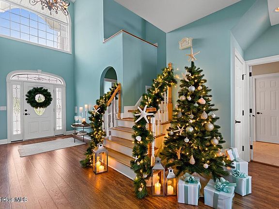 As you enter, the expansive foyer unfolds into a grand great room with a soaring two-story vaulted ceiling, seamlessly integrating with dining and kitchen areas. Natural light floods through large windows, offering picturesque views of the Intracoastal Waterway—a serene backdrop exuding coastal bliss. The living spaces extend outdoors to dual large screened porches and a deck.