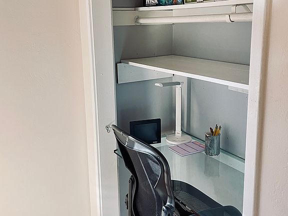 - Built-in desk in bedroom for quiet home office with a door for privacy