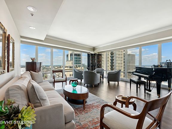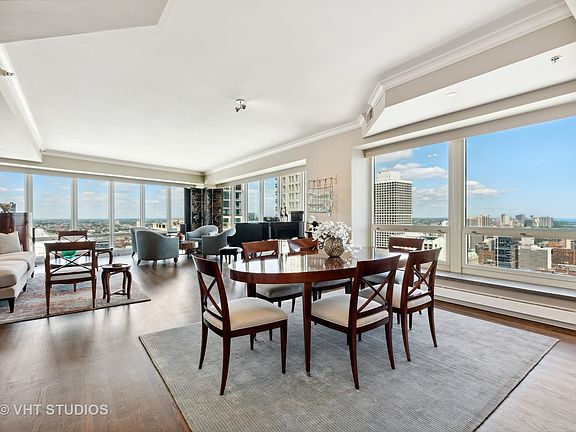 Incredible opportunity to live in a sprawling 3050SF Goldcoast home with panoramic Lake and City views from sunrise to sunset current split 2 bed, 2.5 bath open floor plan is a combination of two units (3BR + 1BR). If desired, the space can easily be converted to a 3BR (potential floor plan under add'l info). Entertainer's dream with spacious living and dining areas featuring wood flooring surround sound, and remote shades that open to expose the large wraparound windows that will wow your guests with the ever-changing views. The chef's white kitchen offers waterfall Quartz countertops, two islands plus a breakfast bar with w/seating. Enjoy cooking with top-of-the-line stainless appliances including Thermador induction cooktop, double convection ovens, Sub-Zero fridge, & Bosch dishwasher. Neff custom cabinetry offers abundant storage including a buffet with gorgeous mosaic backsplash and pull-out drawers for easy organization. The adjacent family room and wet bar nook is a perfect place to enjoy your morning coffee or evening nightcap. The massive primary suite offers plenty of room for an in-home office or sitting area to take in the unobstructed sunset views. Multiple custom closets including a walk-in. A newly renovated en-suite bath with double Quartz vanity and marble dual head shower + rain shower make this Primary suite look as luxurious as it feels. The guest suite features renovated bath with a tranquil Fleurco Aria freestanding tub and separate shower. Side-by-side washer/dryer and an abundance and abundance of storage throughout. 2 heated garage pkg spaces +2 storage spaces included. Bristol's full amenity building features a state-of-the-art gym, indoor pool and hot tub, club room & sundeck with grills. The best of Chicago shopping and cuisine is just out your front door! Steps to the Mag Mile, Oak street shopping, and highly rated restaurants.