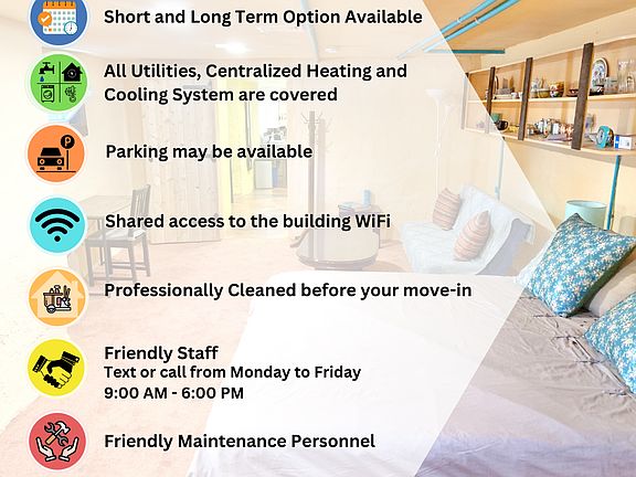 Flexible lease terms, short and longer term available, fully furnished, WiFi and all utilities included. Parking, central air conditioning and heating.