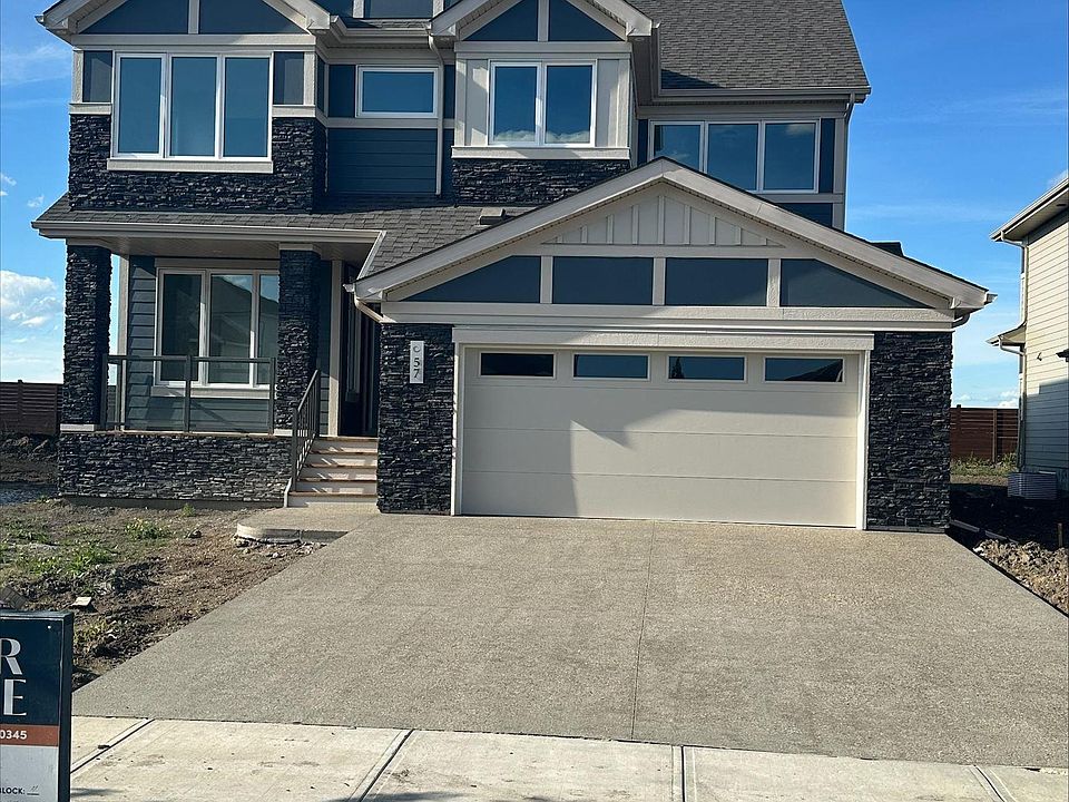 Luxury awaits in the estate collection of Jensen Lakes. The expansive 20’ high ceilings in the living room draw you in to this 2802 sq ft home. The large kitchen has endless cabinetry and a massive island- perfect for entertaining or everyday meals. Main floor also has a closed in flex room and spacious mudroom. The elegant stairwell is open with railing thru out and extra windows for natural light. Upstairs opens up onto a loft with vaulted ceilings and overlooks the main floor living room. The spacious owner’s bedroom is completed with a 5 piece ensuite including a fully tiled shower with a quartz ledge bench and glass door, freestanding tub and dual sinks. The second floor has a laundry room and 2 more bedrooms of equal size with walk in closets with a main bath in between. The home sits on a sizable lot backing onto a walking path. A year round lake with sandy beach and 2 schools K-9 are around the corner. This home is now move in ready!