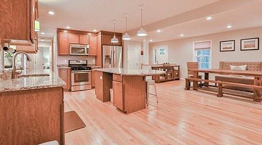 - Kit Dscrp: Window(s) - Picture, Flooring - Hardwood, Countertops - Stone/Granite/Solid, Deck - Exterior, Kitchen Island, Stainless Steel Appliances, Open Floor Plan, Recessed Lighting, Remodeled, Exterior Access