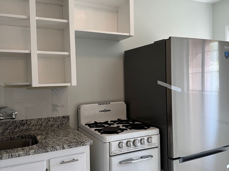 Newly updated unit featuring a modern kitchen with a brand-new refrigerator,
