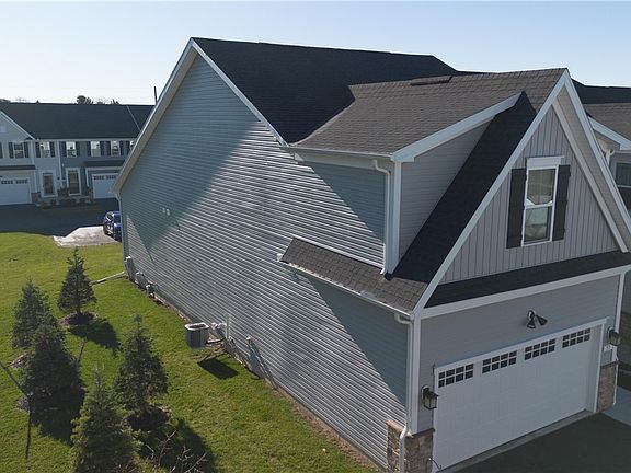 Welcome to 57 Oneida Rd, a beautifully appointed 2021-built end-unit townhome in the sought-after Legion Heights community. This home offers 3 bedrooms, 2.5 bathrooms, and a thoughtful layout designed for comfort, convenience, and modern living. The first-floor primary suite features a spacious walk-in closet, coffered ceiling detail, and a generous en-suite bath filled with natural light. The open-concept main level includes a large living room, dining area, and upgraded kitchen complete with custom cabinetry, an oversized center island, tile backsplash, and upgraded fixtures throughout. Step out from the main living area to the covered rear deck overlooking the spacious lot—perfect for relaxing or entertaining. The second level includes two additional well-sized bedrooms, a full bath, and a versatile storage room with the potential to be finished for even more living space. The attached two-car garage connects directly to the convenient first-floor foyer with laundry and closet storage. The full basement offers excellent expansion potential with an egress window and plumbing roughed in for an additional bathroom. Legion Heights provides low-maintenance living with exterior maintenance included, along with low utility costs. Located just minutes from Canandaigua Lake, shopping, dining, and recreational amenities—this home offers the best of comfort and convenience.