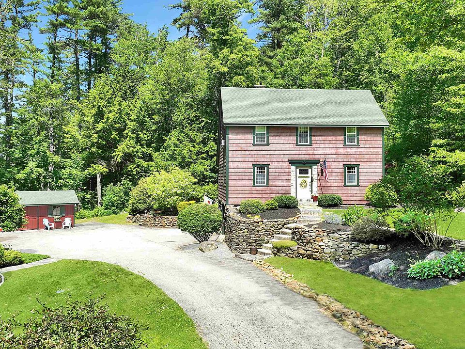 Enjoy Antique home charm with none of the work! Discover the perfect blend of classic New England charm and thoughtful modern updates in this beautifully crafted Antique Reproduction Saltbox Colonial, set on 1.76 private, landscaped acres. Built in 1979, this home features wide pine floors, custom woodwork, and period-style finishes throughout, down to the light fixtures and door latches. The formal living room offers rich wood paneling, Indian shutters, and a brick fireplace. A spacious kitchen with CAFE appliances (new in 2024) and granite countertop is open to the dining room with gas stove, for easy entertaining. Step down into a stunning sunroom featuring arched wood beams with french doors to the patio and gardens. A full bath and guest bedroom or office complete the first floor. Upstairs includes a primary suite with a walk-in closet, a 2nd bedroom, and full bath. A laundry room and office are on the lower level, plus a 2-car garage. Outdoors, enjoy stone walls, granite steps, perennial gardens, an oversized Amish-built shed, and gazebo. When the leaves fall, enjoy seasonal mountain views from the upper level. Located minutes from downtown Jaffrey and the trails of Mount Monadnock, this home offers peace, privacy, and unmatched New England style! Come experience this one-of-a-kind property today!