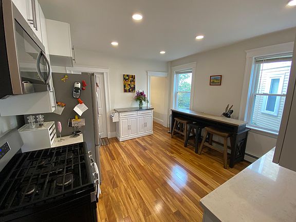 Sunny first floor unit with true hardwood floors throughout. New modern kitchen complete with stainless steel dishwasher, gas stove, dual French doors refrigerator and sliding freezer drawer combination. All nestled between bright white cabinets topped with a complimenting off white sparkled Quartz countertops. The rear of the kitchen is a galley of almost endless base cabinets, upper cabinets and countertop space. New vanity, medicine cabinet and tiles in the b bathroom looks very sharp. 2 equally sized bedrooms with very good closet space. A bonus room in the basement can be used as a gym, office, walk in closet or simply more storage. Free laundry is also provided along with even more storage space in the semi-finished portion of the basement. New gas hot water heater and unit heater are ultra efficient, helping to keep your living costs low. Also included is 1 parking space located at the rear of the property. The spot is tucked nicely to the real grass yard and brick patio. Front and rear porches are also available for your use. Great quiet street located just off the Fellsway and within a 15 minute walk of Malden Center Train Station.