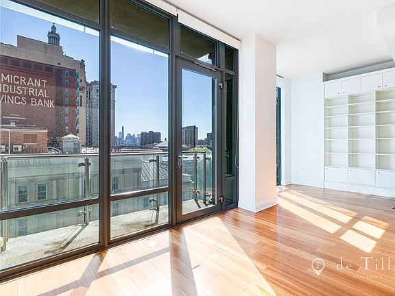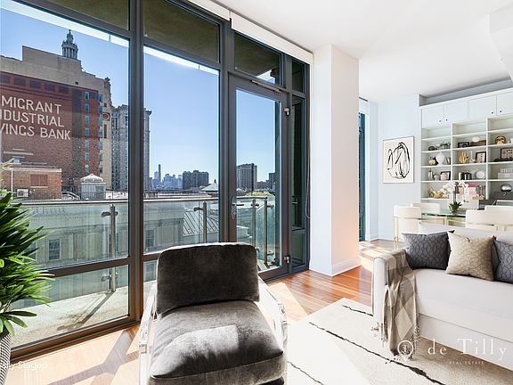 Quality living begins with the separate dining room and living room and continues to the gourmet kitchen, outfitted with stainless steel appliances and a granite breakfast bar. The oversized master bedroom has a walk-in closet and offers enough space for both a king-sized bed and a desk. The dining alcove allows for flexibility as it can be converted into a junior bedroom. The limestone bathroom is sleek and spacious with a deep soaking tub, separate shower and backlit vanity mirror. Other perks include your own washer and dryer and central AC and heating system. Last but not least, you will find the most breathtaking city and Brooklyn Bridge views right off of your own private balcony.