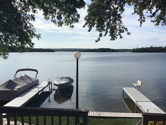 76 Ft., FANTASTIC VIEWS, 4 BEDROOM, 4 BATHROOM, IMMACULATE AND PRIVATE. The beautiful view and unique qualities caught the eye of the current owners of this property. Breathtaking ND sunsets to the West. A very comfortable year round Metigoshe home with 2,263 SF. of living space. Beautifully landscaped with several perennials and mature trees. Very convenient location near the walking path, convenience store, hotel, and dining; all of this within walking distance. Four bedrooms, four baths and lots of storage. Numerous updates to include all flooring, windows, doors, stainless appliances, granite countertops, central vac, bedroom on the main floor, lights and ceiling fans throughout, soft water system. Enter the foyer to a wide staircase. Huge master bedroom on the upper level has ensuite bath, large walk in closet, and tiled walk in shower. Grab your coffee or wine and enjoy yourself on the top deck overlooking the lake. Two additional bedrooms with their own private three quarter sized bath also on this level. Back at the front door, descend to the walk out lakeside level. Open floor plan displays a large living/dining area. Kitchen is very spacious with lots of prep space and all appliances included. Unique wood ceilings and beams. Convenient laundry area, large walk in pantry and office space. 4th bedroom on this level with Jack and Jill entrance to full bath. Half bath and back entry for eager lake lovers use. Step outside to a semi wrap around deck, grilling area, grassy front yard, fire pit and 76 FT, of beach. Attached garage and another second roadside garage. Lots of parking space available. We would love to show you this beautiful home and property.