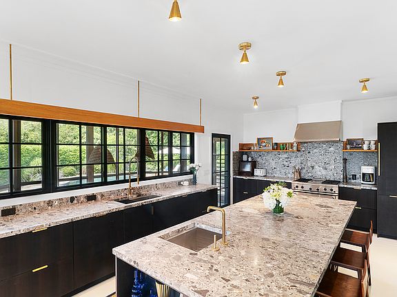 Designed by acclaimed architect Robert McKinley the visionary behind Montauk's Surf Lodge and Ruschmeyer's this South of the highway modern beach house has been featured in Architectural Digest, Vogue, Dwell, and Elle Decor. 57 Seaview Avenue is a rare opportunity to experience Montauk living at its most stylish and comfortable.Ideally situated just moments from the ocean and town, this beautifully renovated and newly furnished home blends modern sophistication with relaxed coastal charm. Its sun-drenched, open layout features expansive windows framing lush greenery and tranquil views.The living room centers around a stunning floor-to-ceiling natural stone fireplace a warm and inviting focal point. The adjacent dining area flows seamlessly to a spacious covered porch, ideal for summer gatherings or quiet evenings outside.At the heart of the home is a chef's dream kitchen, outfitted with Gaggenau appliances, elegant stone finishes, and custom cabinetry. Just off the kitchen, a screened sunroom overlooks the heated gunite pool and offers the perfect setting for al fresco dining or a peaceful retreat.The serene primary suite includes a private deck with ocean views, a spa-like ensuite bath with a soaking tub and separate shower. A second bedroom also features a private deck and ocean vistas, while additional guest rooms ensure comfort and privacy for all.Outside, the beautifully landscaped grounds include a heated pool, expansive slate patio, and outdoor shower designed for effortless summer living. A fully finished lower level with full bath and private entrance provides flexible space for guests, a home office, and a media lounge.