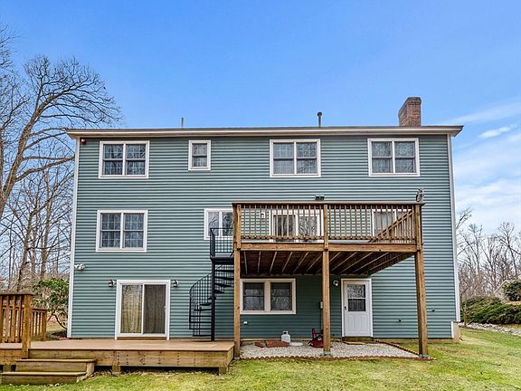 Welcoming 4 bed, 4 bath (2 full, one 3/4, one 1/2) Colonial on 0.54 acres. Hardwood flooring throughout. The granite countered kitchen has hardwood cabinetry, gas range/oven, dishwasher, refrigerator and microwave. Dine in the large family room, the vaulted living room, or on the back deck featuring a spiral staircase leading to the ground level deck. Upstairs has a primary bedroom with a large walk-in closet and full bath; three more bedrooms, another full bath, and a washer dryer closet. Downstairs the partially finished basement has a generous bonus room with 3/4 bath, and spacious storage and work area in the unfinished portion. Access the back yard from the sliding doors in the bonus room, or the walk-out from the unfinished portion. 2 zone heating and central air. One year AHS warranty offered w/ sale of home. Showings through Showing Time. Seller reserves right to accept an offer at any time. Submit offers to listing agent's email. No letters, please.