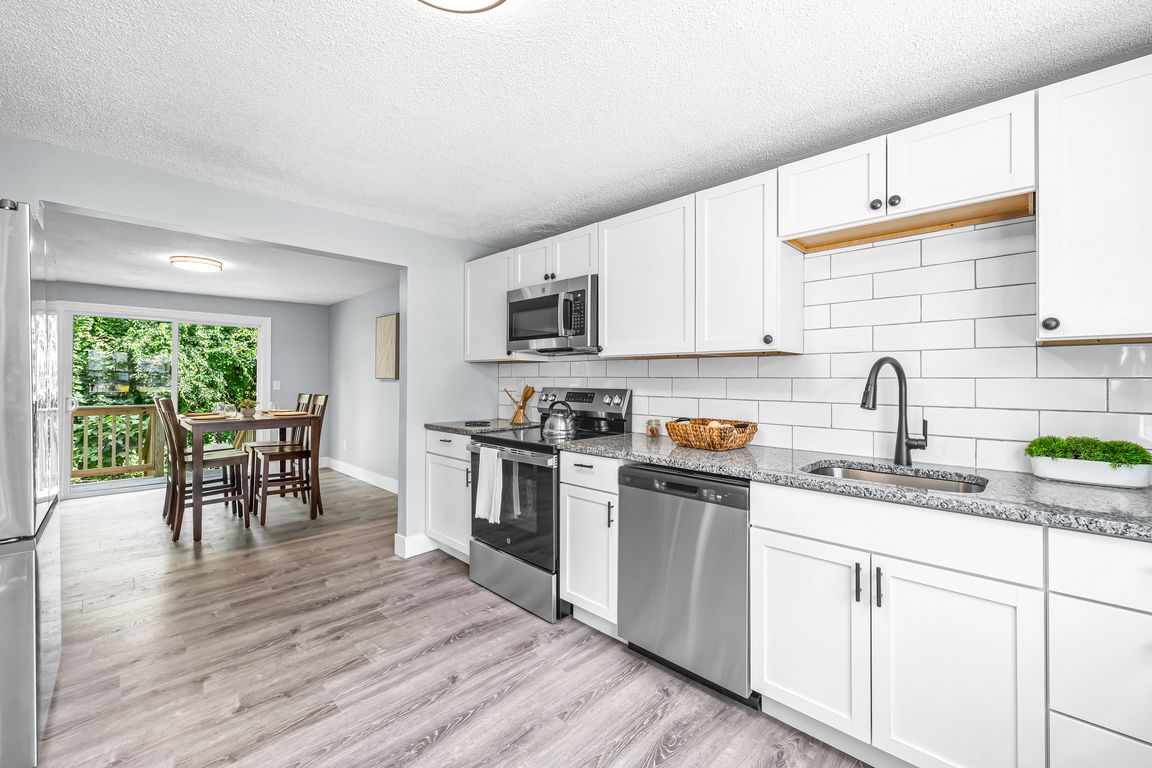 Tiled showerDeck and patioBeautifully appointed kitchenPeaceful woods viewStylish shaker cabinetsModern backsplashPrivate outdoor haven