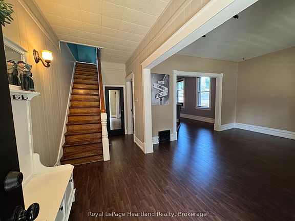 Welcome to this delightful 1.5 storey home offering 2 bedrooms with the potential of a 3rd on the main by converting the living room by closing it and adding a closet. The main floor features a spacious kitchen with ample cupboard space, a cozy family room with a gas fireplace, and patio doors leading to a tiered deck that overlooks the large, fully fenced yard perfect for entertaining, children or pets and let's not forget about the small storage shed that completes the backyard. Convenient main floor laundry adds to the ease of everyday living along with a 2pc bathroom. Upstairs, you'll find comfortable sized bedrooms, a 4pc bath and flexible space to suit your needs, while the basement provides plenty of storage. A welcoming front porch makes the perfect spot to relax and enjoy your morning coffee. Some updated flooring, drywall and paint gives this home a fresh touch. Ideally located just a few blocks from Main St, the arena, local churches and the school, this property combines small-town charm with the easy access to everyday amenities. Water Heater(2025). Seller's have purchased dark grey siding and a small garden shed frame, neither of which will be installed or assembled prior to closing however both items will be left with the property for the buyer if desired.