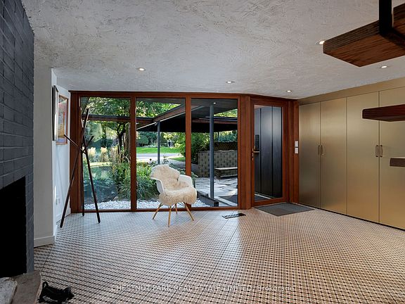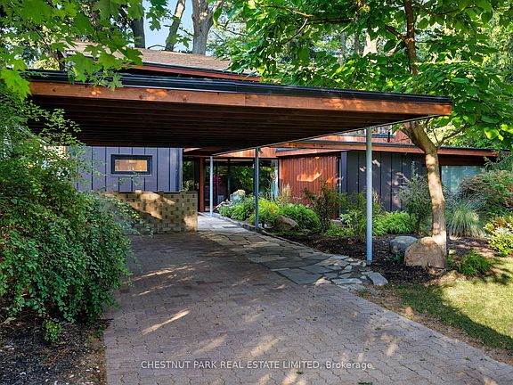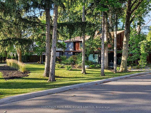 Architectural jewel in The Kingsway! Mid-century framework, Bauhaus clarity, and a setting that steals the show. Set on a ravine-kissed, cul-de-sac corner lot - 60 feet at the street widening to nearly 134 at the back - the property feels like a boutique spa submersed in nature: terraced gardens, multiple outdoor living zones, a sauna, and a cold plunge. You forget the city, even as Humbertowns renewed shops and Royal York & Bloor sit minutes away. Inside, light pours through floor-to-ceiling windows, framing gardens and wooded vistas. A floating staircase anchors the foyer; cedar-lined ceilings and oak floors bring warmth and texture. Sightlines, symmetry, and quiet discipline guide the plan - function meeting form without fuss. The main-level retreat opens directly to the landscape, complete with dual custom walk-ins and a spa-calibre ensuite. Above, a modernist kitchen with marble counters and custom cabinetry flows into dining and living, punctuated by a granite fireplace and dramatic glass wall pivots to the outdoors. Every space feels intentional; every detail, considered. Not just a house, but an authentic expression of mid-century living - embracing light, celebrating landscape, and inviting creativity. For the design-minded who believe home should inspire, 57 Wimbleton is a residence of rare poise, shaped by light and nature.