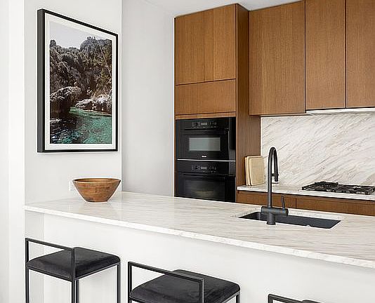 The custom-designed Lineadecor kitchen has a Calacatta Alto marble countertop and backsplash, and Lineadecor walnut-stained oak cabinets. It features a Miele refrigerator and dishwasher, 4-burner Miele gas range with built in vented hood, convection oven and speed oven, Zucchetti fixtures in matte black, and Elkay E-granite black undermount sink.