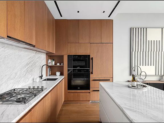 Completely outfitted with custom walnut-stained oak cabinetry, topped with polished Calacatta Alto slab marble countertops and a full suite of Miele appliances, the open chef's kitchen seamlessly merges living and dining. The 10 foot long breakfast bar offers abundant seating and ample counter space.
