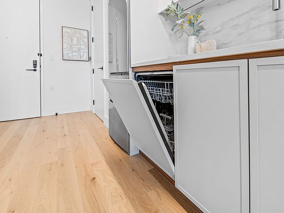 Each studio, one-, and two-bedroom home is crafted with thoughtful proportions, a natural palette, and modern comfort. This particular layout features a separate kitchen, offering a dedicated cooking space apart from the main living area perfect for entertaining or enjoying quiet meals at home. Sunlight pours in through oversized windows, and built-in details like shelving and integrated lighting bring functionality to the foreground.