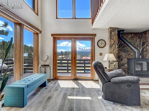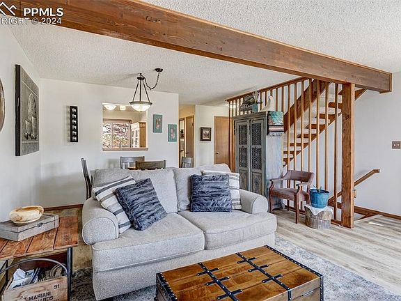 Well maintained & with unmatched mountain scenery, this cozy townhome feels like a mountain cabin retreat...true urban living with the convenience of nearby lifestyle ammenities! MAIN LEVEL FEATURES: LR/DR open concept w/beam ceiling, incredible views of Pikes Peak mountain range, 2 story floor to ceiling windows w/remote blinds & ceiling fan, newer Luxery Vinyl flooring flows seamlessly through the home, 2021 Gas Stove Fireplace- heats all of main/upper floors, or can use electric baseboard heat. The spacious kitchen ammenities: all newer stainless appliances including a gas stove/range, gorgeous porcelain counters & backsplash (stronger than granite) & custom painted cabinetry. A 3/4 bathroom w/wlk in shower is also a convenient feature on this level. SECOND FLOOR FEATURES: First is a cozy but spacious loft w/ lux vinyl flooring & grand majestic views. This bonus room/loft is perfect as an office, reading nook, workout space. Could enclose for 3rd bdrm, Down the short hall is the completely remodeled full bathroom featuring granite counter, stainless fixtures, new lighting, tiled tub/shower/flooring & washer-dryer in closet w/custom Soji door. Finally, the expansive Primary Bedroom is a relaxing retreat complete with wall to wall closet space & shelving, a large picture window, ceiling fan & fresh carpeted flring. DOWN TO BASEMENT: FEATURES: A Comfortable 2nd bedroom also w/lux vinyl flooring, new baseboard & crown molding, large closet-w/ 2019 Wtr heater & 2nd set of washer/dryer hookups & plenty of closet space, a picture window w/custom grate (protects window from sleeping deer.), wall heater & baseboard heat provide more than adequate heat. GARAGE AMMENITIES include oversized one car with custom workstation, peg board & cabinets, closet & storage shelving & 3rd area to hookup washer/dryer or add tub sink. EXTERIOR: front to back trex deck-a living space of its own with panaramic views!!! HOA to stain all exterior dur. 2024 summer. THIS IS AN AMAZING HOME!