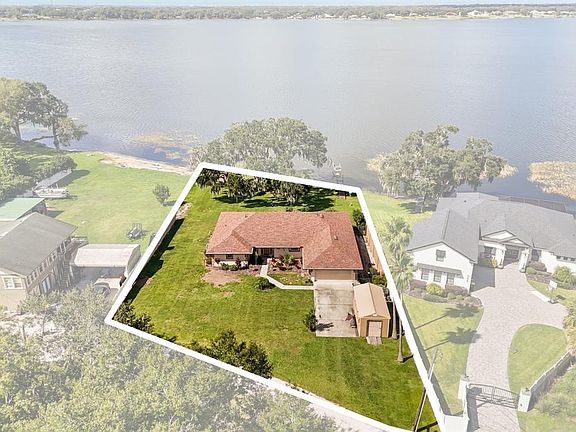 Amazing opportunity to own a beautifully updated lakefront home on Lake Juliana. Experience exquisite lakefront living at its best with this 3 bedroom, 2 bath home plus a bonus room or office situated on a 0.54 acre corner lot with approximately 120 feet of waterfront. Enjoy stunning sunset views, direct boating access, and the freedom of no HOA. This property also qualifies for USDA 100 percent financing, offering an incredible chance for affordable lakefront ownership. Bedrooms 2 and 3 feature separate entrances, ideal for multigenerational living or income producing potential. Inside, you will find an open floor plan with a split bedroom layout for privacy. When you tour this home you'll notice the huge amount of storage! The homeowners have meticulously maintained this property, and nearly every major detail has been updated, including a newer roof (2021) and gutters with gutter guards., 4 ton 14.3 SEER air conditioning system (2023), 50 gallon water tank (2021), and Ultraviolet in duct air purification system (2025). The kitchen and both bathrooms feature luxury vinyl flooring, LED recessed lighting, and updated vanity, showers, and fixtures. Additional upgrades include a Jacuzzi walk-in shower (2020), newer appliances including washer and dryer (2020), dishwasher (2023), stove (2024), plus a new combination water softener and whole house filter system (2025). The home also features new pavers in the screened lanai, a 20x10 storage shed, newer windows, new carpet in the office (2024), updated lighting and hardware. Enjoy mornings on your screened lanai overlooking the lake or afternoons fishing and boating from your private dock. Surrounded by mature oak trees and nicely manicured landscaping, this home offers an exceptional combination of comfort, flexibility, and waterfront living.