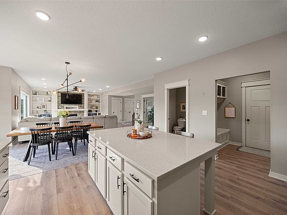 Main level upgrades: brand-new LVP flooring, fresh paint, bright white kitchen, and a striking fireplace wall with built-ins