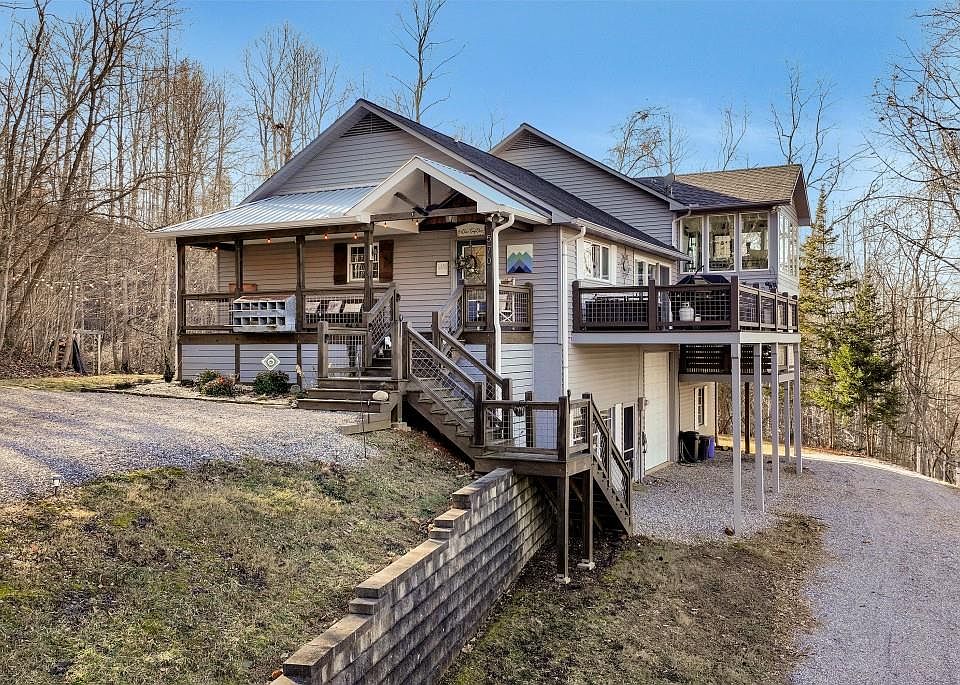 BEAUTIFULLY UPDATED LAKE HOUSE!!! Look no further, this priced to sale charmer will be gone before you know it! Located on Lake Chatuge, enjoy all 4 seasons of this wonderfully appointed home with scenic views of the lake that can be enjoyed from the main floor, heated deck, or hot tub! With a double split driveway, this home comes with one of the biggest and flattest lots in the area on 1.49 acres. That means a spacious yard that is perfect for entertaining or having a cozy evening around the fire pit, while the rest of the family relaxes under the nearby custom gazebo. It's an outdoor lover's dream! Huge bottom floor is fitted to have a guest suite built in (Airbnb it out or studio Apartment for extra income). Over 20-foot garage door installed for stowing your boat along with room for 2 cars or your RV (Electrically wired for a 30 AMP). The main floor is fitted with a gorgeous front porch that is incredibly spacious. The interior of the home is updated with a "modern farmhouse style" that can be seen with barn doors throughout, beautiful exposed wood beams across the high vaulted ceilings (adding to the openness of the space) and upgraded fixtures. The kitchen is remarkably furnished with floating shelves and track lighting. Appliances are like new! Huge living area with beautiful stone framed gas fireplace that can be controlled with an easy click of a remote. Updated flooring throughout the entire house and unique touches through and through. The main floor has its' own large deck that is equipped with a grill and a desirable view of the lake! This floor also has a guest suite with a built-in closet and a full bathroom. Head downstairs to a flex room that can be made into an office or workout room. This room opens up with large sliding glass doors to another covered deck that can be included with a hot tub to enjoy all year round! There's also an additional spacious room on this floor that can easily fit 2 queen sized beds; can be used as another guest suite, playroom, or a man cave! This room includes a large closet along with another full bathroom that is updated throughout, so the opportunities are endless. Head upstairs to the very top floor to enjoy the incredible master suite with vaulted ceilings decorated with wooden beams! Extremely spacious walk in closet through barn doors with built in shelves throughout. The master suite has its' own beautiful private sunroom and custom heated floors. This room has the best view of the lake through 360 glass windows that flood the area with natural sun light. Beautiful modern farmhouse styled master bathroom with double vanity and shiplap walls come with the master suite as well. A giant walk in shower and a vanity goes perfectly with the magnificence of this master suite. Request a showing TODAY because this beautiful lake house will be gone tomorrow!