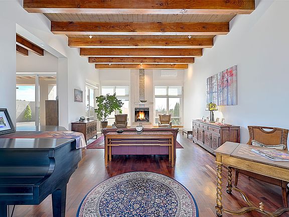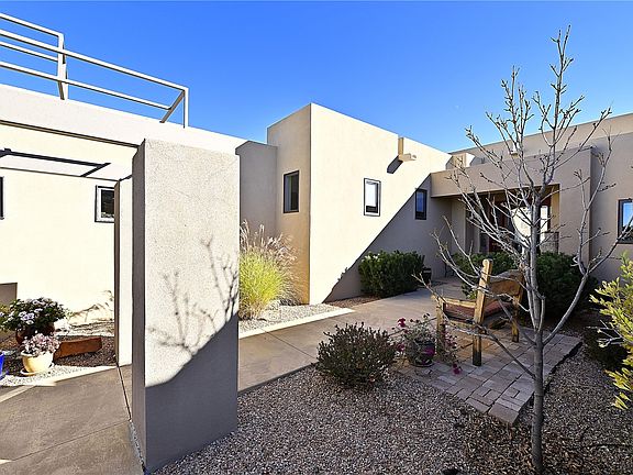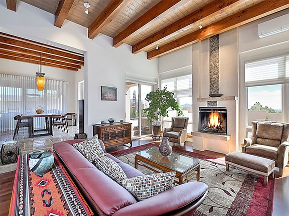 Perched on a hilltop with breathtaking views of the Sangre de Cristo Mountains and city lights, this exceptional home offers a unique blend of tranquility and convenience, just minutes from the historic Santa Fe Plaza. Enter through a dramatic Zen-like courtyard and step inside to see the spacious living room that will captivate you with tall, beamed ceilings, mesquite wood floors, and a stunning fireplace surrounded by tall view-filled windows. The gourmet kitchen features custom cabinetry, high-end appliances, and a central island with a stone countertop. Strategically located and open to the kitchen is an informal living and dining area, perfect for relaxing and movie watching. The dining room offers spectacular views of the mountains and city lights. The primary suite is a luxurious retreat, with rich wood accents, large southern windows, and a spa-like bathroom featuring dual vanities, dressing areas, a jetted tub, a spacious shower, and a deep walk-in closet. The guest bedrooms are intelligently positioned for privacy, while the third bedroom, with a courtyard entrance, provides versatility as an office space. Recent upgrades include a brand-new roof, fresh stucco, and solar energy, enhancing both efficiency and sustainability. Surrounded by protective walls, the grounds feature beautifully lush yet low-maintenance landscaping, creating a serene outdoor environment. Expansive patio areas under deep portals offer multiple options for alfresco dining and relaxation.