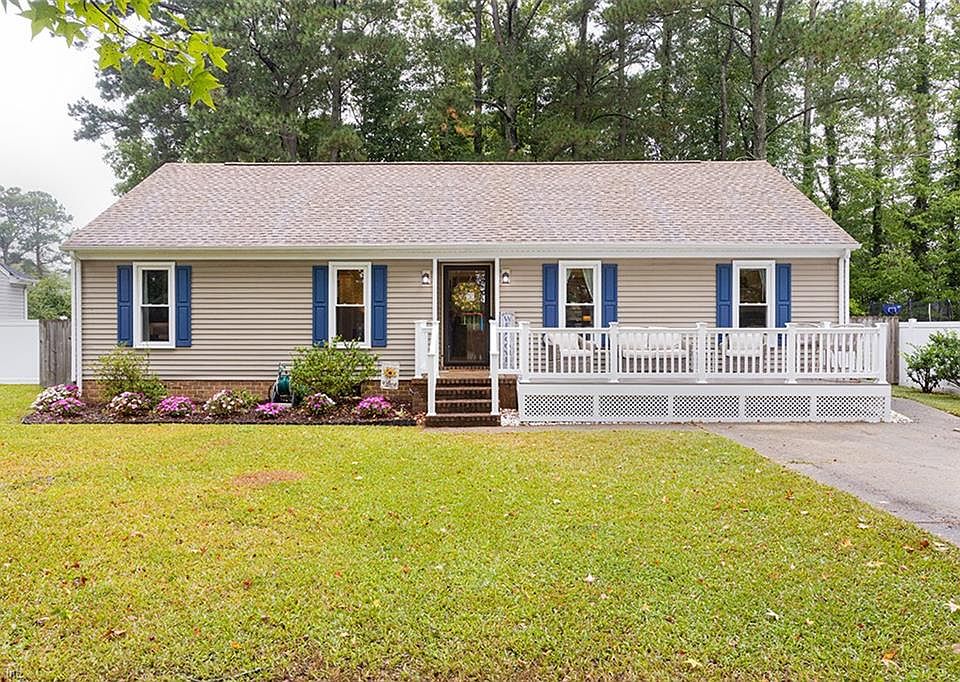 This beautiful ranch home is located in the heart of the Coveted Great Bridge & Cedar Road Elementary district. Beautiful LVP flooring throughout recently laid. NO Carpet! Enjoy sitting outside on the brand new front porch! Inviting and full of natural light this updated & upgraded home gives a warm and welcoming feeling! Eat in Kitchen with plenty of cabinet/counter space, backsplash, updated lighting. Dining room is being used as an office. Large Living room can easily accommodate 2 seating areas. Spacious Primary bedroom with its own en-suite. Newer windows keep the home warm and sound proof! Ample parking 4 cars in driveway with room to back up/turn. Fenced in backyard with wooded view. 2 sheds (large Rubbermaid is new), Paved patio area for gazebo to relax! Come home today!