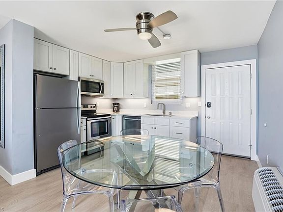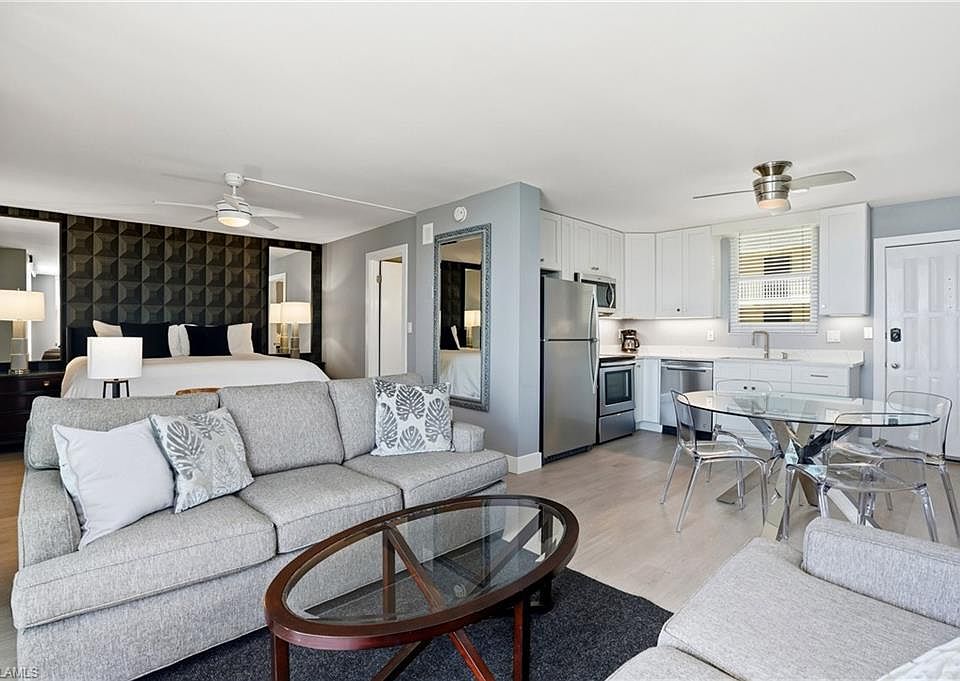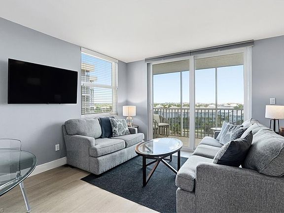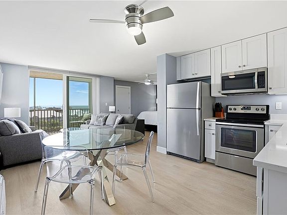Tastefully remodeled and fully furnished 8th floor unit! This efficiency condo is conveniently located across from Bonita Beach and Doc's Beach House and offers many amenities including two community pools, tennis courts, pickleball, bicycle storage, and more. This unit also comes with its own all in one washer/dryer, new water heater, brand new stainless steel appliances, beautiful quartz countertops, newly installed under cabinet lighting, and premium McMillan "white oak" laminate flooring throughout. This is the ultimate beach getaway with gorgeous Southern Gulf views. Great potential as a future investment with relaxed rental restrictions allowing owners to rent 121 times a year for a minimum of 3 days! The white sandy beach awaits, bring your flip flops!