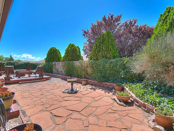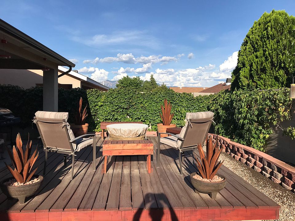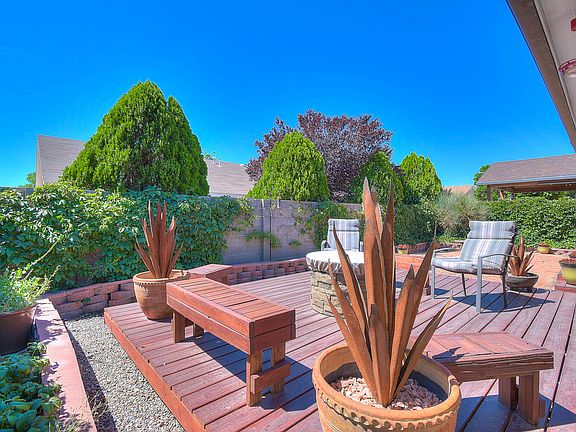Meticulously maintained, move-in ready Single Story. Brand New 30 year Pitched Roof & Gutters. Private backyard oasis setup to enjoy our great New Mexican weather; lovely deck, flagstone patio and lush green landscaping. Spacious owner's suite with great amenities; walk-in closet, separate shower, soaking tub, water closet and double sinks. Smart floor plan has secondary bedrooms separate from Owner's suite. Excellent location; community park, the Park Above, Rust Medical Center and Medical Park, Cottonwood Mall with hundreds of shops, services, Costco, restaurants, 20-25 minutes to Sunport Airport. Floor plan is online ... be sure to 'walk through' the Matterport 3D tour.