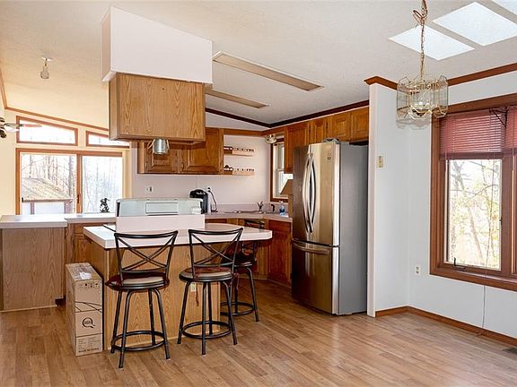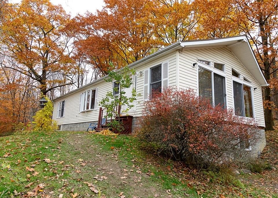 Have a piece of paradise! 1456 sq ft ranch home on 10 acres of wooded property, boarded by a creek and waterfall. Living room has stone fireplace with electric insert, laminate floor, and sliding glass doors to take in the view. kitchen with newer stainless refrigerator and stove, range hood and flooring. 3 bedroom 2 full bath, 1st floor laundry. 3 car garage with lift area. Freshly painted interior. Full walkout basement perfect for workshop or finish for extra living space! Natural gas and public water.
