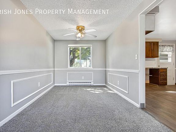 Step inside to a living/dining area finished in a fresh neutral palette and plush carpeting, accented by classic wall moldings and a large picture window that fills the room with natural light.