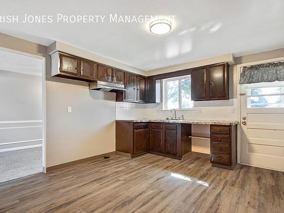 The main level flows into the kitchen with dark wood cabinetry, durable LVT flooring, and hookups for an electric stove. Be sure to bring your appliances! A convenient half bath sits just off the kitchen, perfect for guests and everyday ease.