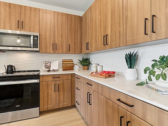 - Exterior features: 12-foot ceilings in live/work apartments*, 4 Courtyards, 8' entry doors, BILT Rewards, Barbecue, Bicycle storage, Chef-inspired kitchen islands*, Climate-controlled interior hallways, Conference rooms, Coworker Space, Custom built-in shelving*, Deep basin kitchen sinks, Designer finishes, EV charging stations, Floor-to-ceiling windows*, Glass-enclosed showers*, Lawn, Live/Work storefront entries*, Oversized tubs, Package Receiving, Parcel locker room with cold storage, Pet Park, Pickleball court, Quartz countertops, Smart locks, TV Lounge, Two interior color schemes available, Wellness center with fitness-on-demand, Wood-style plank flooring
