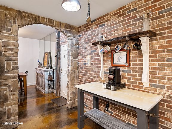 Welcome to your exquisite, maintenance-free living residence located in the heart of St. Matthews, in the prestigious Royal Coach. This residence boasts high ceilings, freshly painted interiors, cement stained flooring, stone archway, brick wall, and reclaimed wood finishes throughout that seamlessly marries timeless charm with modern convenience. Stepping through the stone archway into the kitchen, you'll be greeted by charming details including a brick wall, white subway tile backsplash, sleek black matte stainless steel appliances, granite countertops, pristine white cabinets adorned with clear/silver knobs, a striking copper-colored sink, and convenient built-in shelving. Ideal for culinary enthusiasts, this space is a dream come true. Continuing into the open-concept dining and living area, you'll appreciate the soaring ceilings and the cozy fireplace nestled beneath the stairs leading up to the loft. Natural light floods the space through the balcony door, offering a tranquil view of the shared greenspace, an ideal spot for morning coffee or relaxation. Ascending the reclaimed wood stairs, you'll find a cozy loft overlooking the living area, complete with ceiling cabinets and ample closet space for storage. Rest assured in your generous sized primary bedroom featuring three closets, two dual sink areas, and walk in shower. The second bedroom features a sliding door, built-in shelves and cabinet in the closet. The second full bathroom, located down the hall, features a jet tub and rustic finishes including reclaimed wood accents, black gorgeous tile, and brass fixtures. For added convenience, the washer and dryer are discreetly tucked away in this unit. This home comes with two garage parking spaces and two storage closets. The Royal Coach community offers an in-ground pool, secured buildings, party room, and covers water, trash, sewer, snow removal, security, exterior maintenance, and groundskeeping. Royal Coach #57 truly encompasses the epitome of luxurious living you may never want to leave. However, should you need to venture out, you're just minutes away from groceries, coffee shops, boutiques, restaurants, medical centers, banks, gas stations, public transportation, and expressways.
