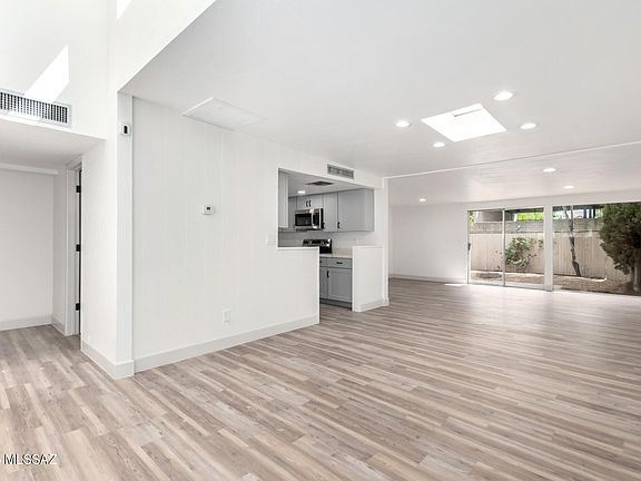Welcome to this charming Townhome located in the wonderful Orchard River Community! Delightful open floor plan, showcasing wood look flooring, skylights in the living area, high ceilings, clerestory windows, and backyard access. The spotless galley kitchen enjoys shaker cabinets, quartz counters, & recessed lighting. Brand new SS Appliances are smooth top electric stove, OTR microwave, & dishwasher. The main bedroom boasts a vaulted ceiling, sliding door closets, & an ensuite with a fully tiled shower. Relax during the evening in the well-sized backyard complete with large trees, & a convenient storage shed (as is). The Orchard River Community offers plenty of walking areas, well-kept landscaping., carport, and pool. Located near Fort Lowell Park and recreation, a MUST see! Agent/Owner